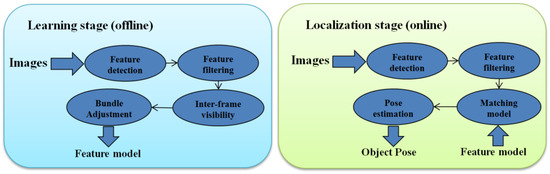 This algorithm is divided into two stages: the learning stage (or offline stage), in which the model of the object is created, and the localization stage (or online stage), in which the object is detected and its position is estimated. Figure 1 summarizes the pipeline of the algorithm in both the modeling and localization stages.