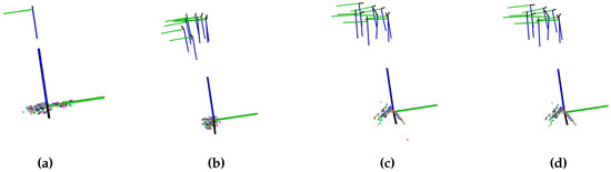 Different steps of the Bundle Adjustment optimization process. (a) Starting state; (b) First iteration; (c) Iteration 5; (d) Iteration 20.