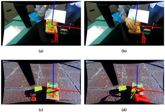The algorithm is also proven to be robust to occlusions. The position of the object can be reconstructed with a small fraction of points of the model. Figure 10a,b shows the estimated position of an object occluded partially by a person. Additionally, in Figure 10c,d, one can see how the position of the object remains stable, even with the arm occluding the object during the grasping trajectory. It is noticeable that the position is more stable than the orientation against partial occlusions.