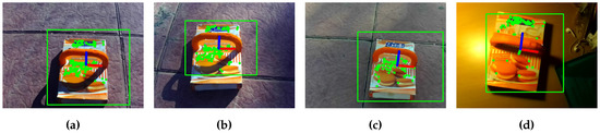 The performance of the FAST/SIFT features under different light conditions was also validated, as can be seen in Figure 11. This figure shows the result of the object detection and pose estimation with different types of lights and shadows (indoor, outdoor with shadows, and without shadows). The algorithm performs well in outdoor environments with and without shadows, as the camera automatically adjusts the exposure of the sensor. Indoors, the result is initially the same. However, as the exposure time of the camera increases, the image is more prone to have motion blur. This implies large variations in the feature descriptors. Because of this, the algorithm may lose the object tracking during fast movements.