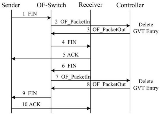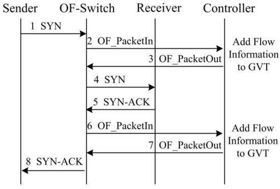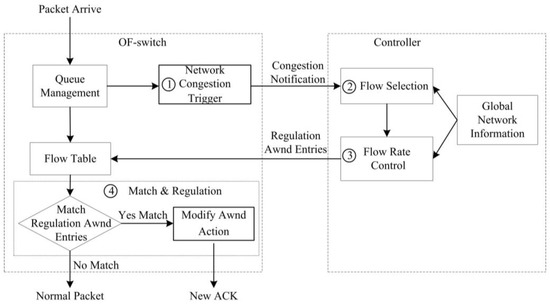 - Flow Match and Regulation. Once TCP ACK packets from the receiver match the regulation awnd entry at OF-switch, the awnd field of these packets will be modified to the desired one and then the packets are forwarded to the sender. After receiving these modified ACK packets, the sender will adjust swnd in terms of Equation (1). In this way, the sending rate can be decreased to our desired one.