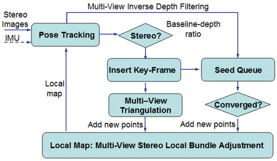 Long-range stereo depth error (bias) can be effectively reduced by introducing additional stereo observation over time, namely multi-view stereo with a dynamic pseudo baseline. The pseudo baseline between the stereo frames can be used for the triangulation of the long-range stereo points. The fixed stereo baseline can provide an absolute scale constraint. Based on this idea, we developed a sparse feature-based stereo VO both for short- and long-range cases. The pipeline of the proposed long-range stereo VO is shown in Figure 1. It is a key-frame-based VO technique. The local map consists of a set of 3D sparse map points that is generated by selected key-frames. Furthermore, IMU information is integrated to further improve the robustness for aggressive camera motion and repetitive texture environments. Based on the current stereo baseline-depth ratio, the VO system switches both key-frame and new map point generation strategies between stereo and monocular modes: