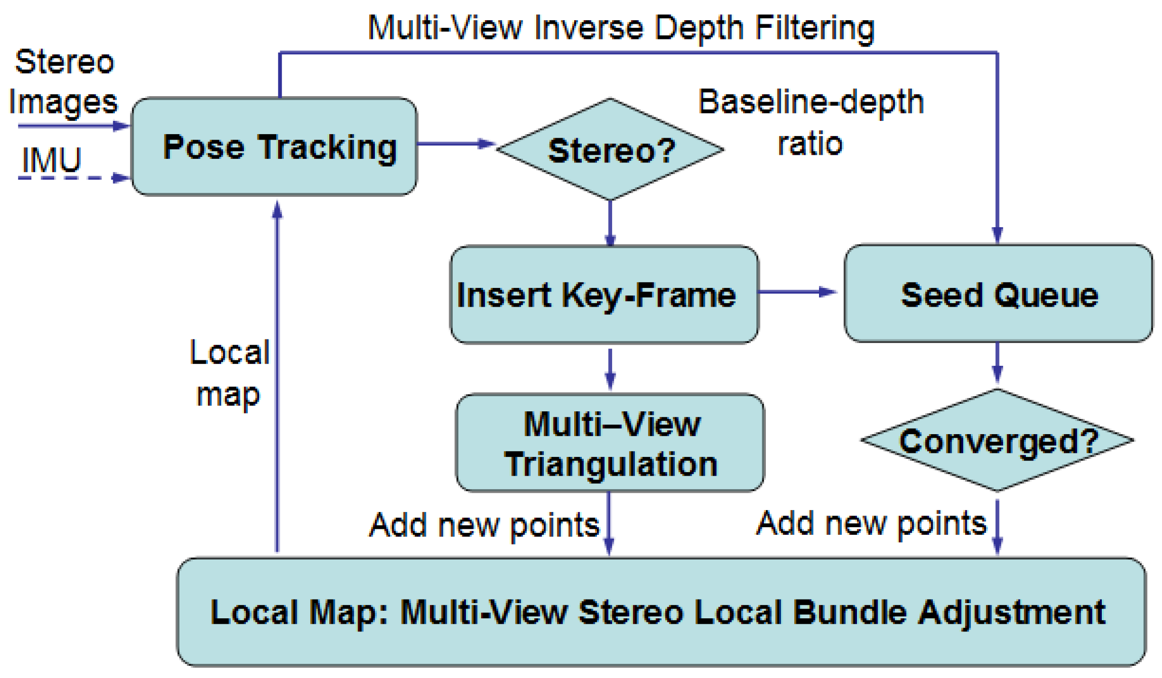 - new features with an effective stereo depth (i.e, short-range points, with enough stereo disparity).