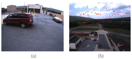 Figure 2. Short-range and long-range environments. (a) Short-range environment. In this situation, most of the features are directly triangulated by static stereo baseline. (b) The long-range environment can also detect some large disparities of “short-rang” features (red dot) due to incorrect matching for the repetitive texture area. For this case, most of the "short-range” features are outliers; thus, they cannot be directly triangulated by static stereo baseline. - (2)