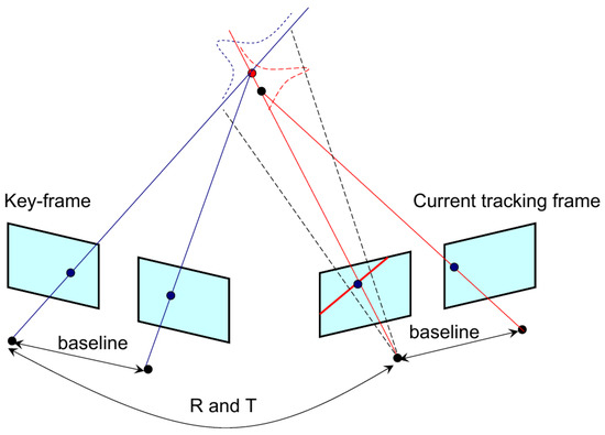 The new long-range points without depth will first be triangulated using both the pseudo-baseline and the static stereo baseline from multi-view stereo measurements. The pseudo baseline is formed by the “relative pose” between the neighboring key-frames. As shown in Figure 3, the current left image feature is searched in the previous key-frame’s left image feature set on the basis of an epipolar constraint, and for each key-frame, the matched feature pairs also have their own corresponding features in the right image. To make the matching more robust, the epipolar constraint between right image features is also checked. As a result, for each new map point, four matched features can be obtained between two key-frames, and the map point is triangulated as the intersection point of the four rays in the sense of least-squares.