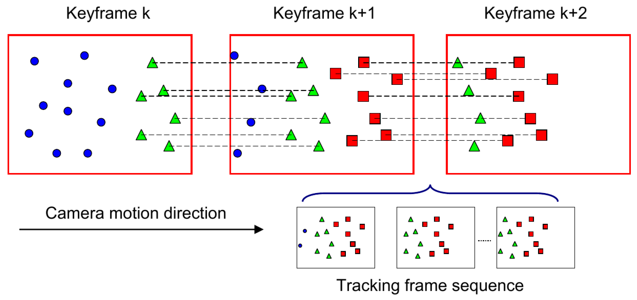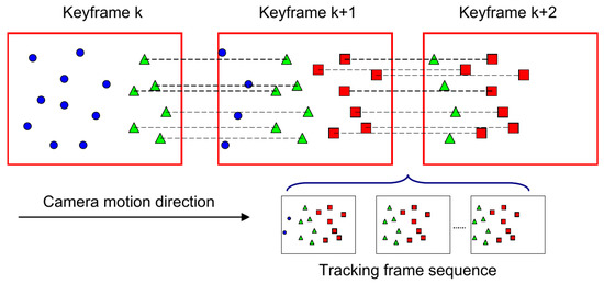 An example for the camera exploration mode. For the k-th key-frame; the blue points indicate the “old” features that have been matched with the map; and green triangles are the new features that await triangulation. For the (k + 1)-th key-frame, green triangle features can be triangulated, and some new features (red rectangle) wait for the next key-frame for triangulation. Between the (k + 1)-th key-frame and the (k + 2)-th key-frame, there is a set of tracking frames that also can provide useful measurements for the new features (red rectangle); we integrate all of the multi-view observations for the new feature using an inverse depth filter.