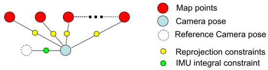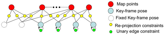 The factor graph for the long-range stereo is shown in Figure 5. We add a unary edge to each key-frame pose vertex. Consequently, the local BA will mainly focus on the map point optimization, and the key-frame’s pose can only be changed in a small range. The factor graph is more like a structure-only bundle adjustment since the camera pose tracking has been fused with the IMU motion information (the IMU coupled odometry will be discussed in Section 3.5).