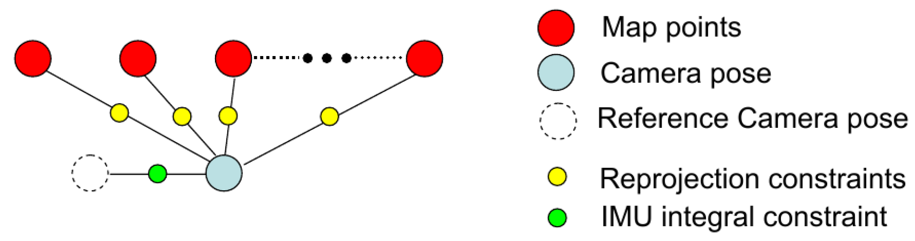 The integration of an IMU motion prior to stereo VO has two advantages: (1) it provides a good initial motion guess for feature guided matching; (2) it gives a motion prior constraint for odometry optimization. We designed a tightly-coupled stereo VO by adding an IMU integral constraint into the 3D-2D re-projection cost non-linear optimization framework. Figure 6 shows the factor graph for the stereo VO; the camera pose tracking w.r.t. the local map can also be seen as a motion-only bundle adjustment. In this graph, map points and reference frame pose are fixed; only the current pose is set free for optimization. The cost function is: