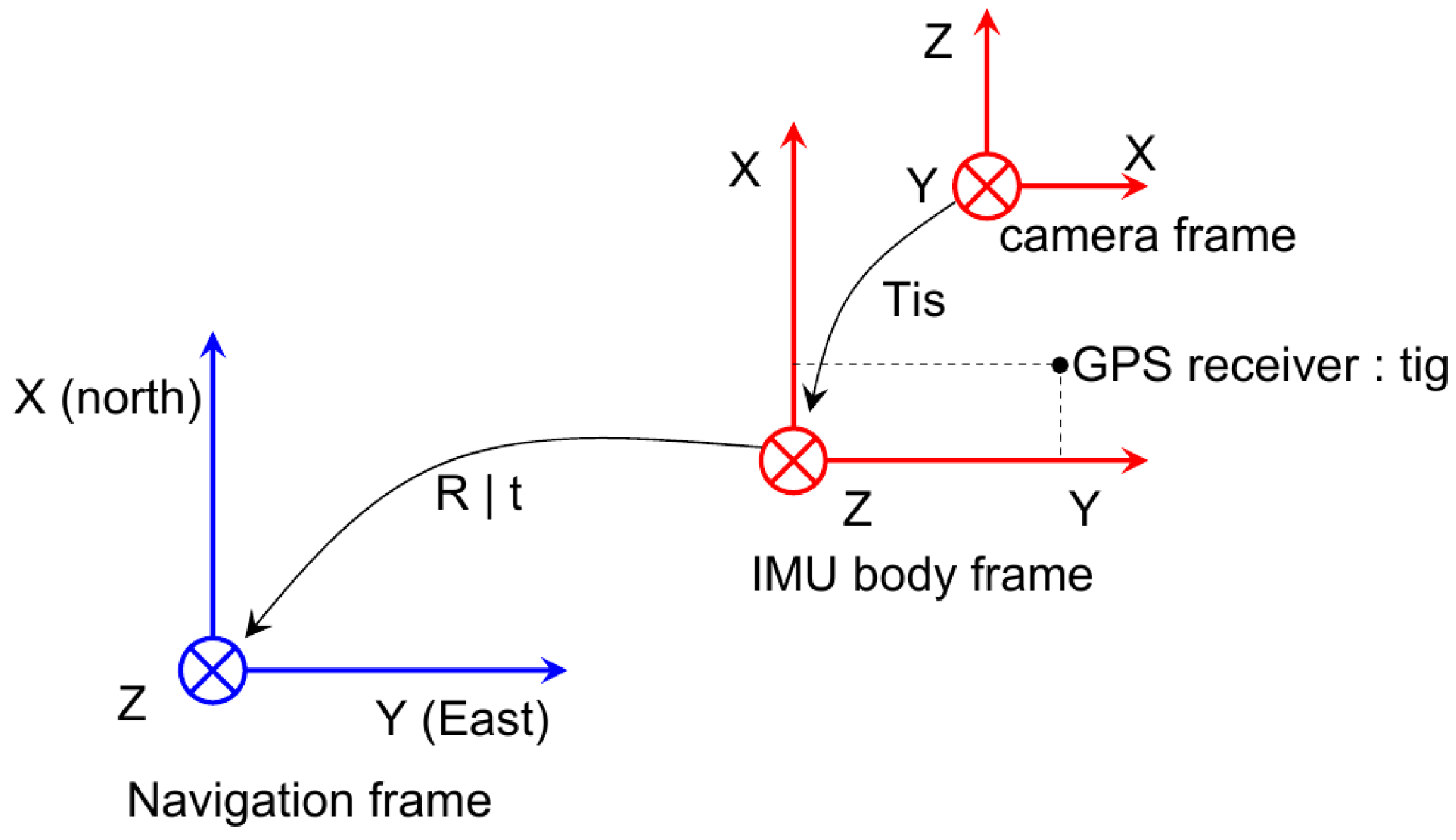 Definition of coordinate frames for EKF state estimation. The navigation frame (or world frame) is a local NED (North-East-Down) frame. The transforms R and t from the IMU body frame to the navigation frame will be estimated by the EKF. The parameters (from the camera frame to the IMU body frame) and (GPS receiver coordinate in IMU body frame) are obtained by calibration.