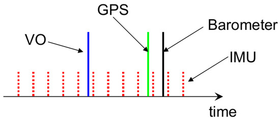 For the EKF implementation, a ring buffer with a 2-s time is kept to save all of the incoming sensor data. As shown in Figure 8, when a new VO measurement arrives, its time stamp is usually not the most up to date due to the image transmission and the stereo VO calculation delay. For this case, after the update of the EKF state on the VO time stamp, all of the subsequent IMU integral should be re-integrated to re-predict the current state. The same processing is also carried out for GPS and barometric measurements. To further decrease the computational cost of IMU re-integration, the IMU pre-integral technique in the IMU body frame can be utilized.