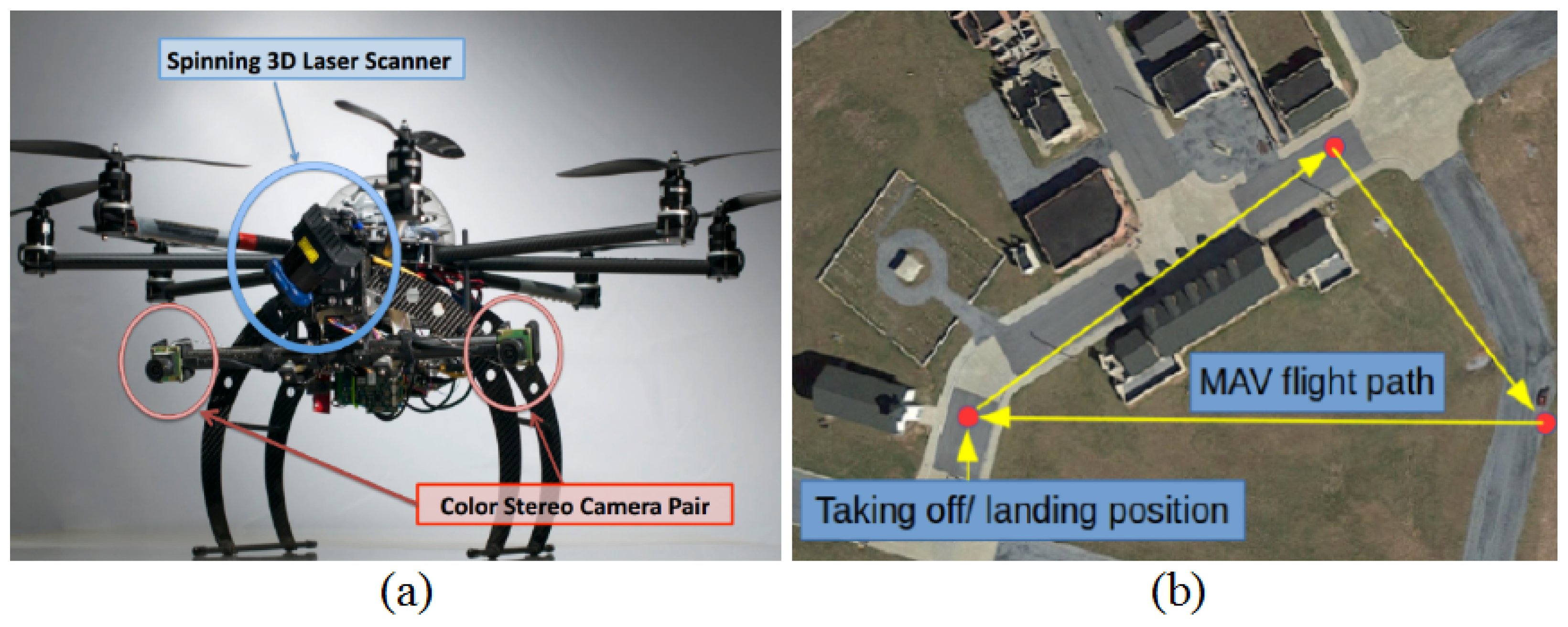 In this section, we present the experimental results for the proposed technique. Figure 9a shows the MAV developed by our team for the state estimation experiments; some additional sensors, including a commercial GPS, stereo camera, an IMU (Microstrain 3DM-GX3-35 [27]) a barometer and a spinning laser scanner, were carried onboard by the MAV for dataset gathering. All the sensors are hardware triggered, so the timestamps for different onboard sensors have the same time reference. The IMU was recorded at 100 Hz; the barometer rate was 7 Hz; GPS was 4 Hz; and stereo was 10 Hz. For the forward facing stereo (about pitch) with a 0.41 m static baseline, its effective short-range measurement is 13.41 m with a 10-pixel stereo disparity. The datasets are gathered in Fort Indiantown Gap, Pennsylvania. Figure 9b shows the experimental scenario from Google Earth and the schematic flight trajectory for the MAV. For the dataset, the MAV flies 12 min with aggressive six D.O.F motions. Some topical scenarios for this experiments are shown in Figure 10.
