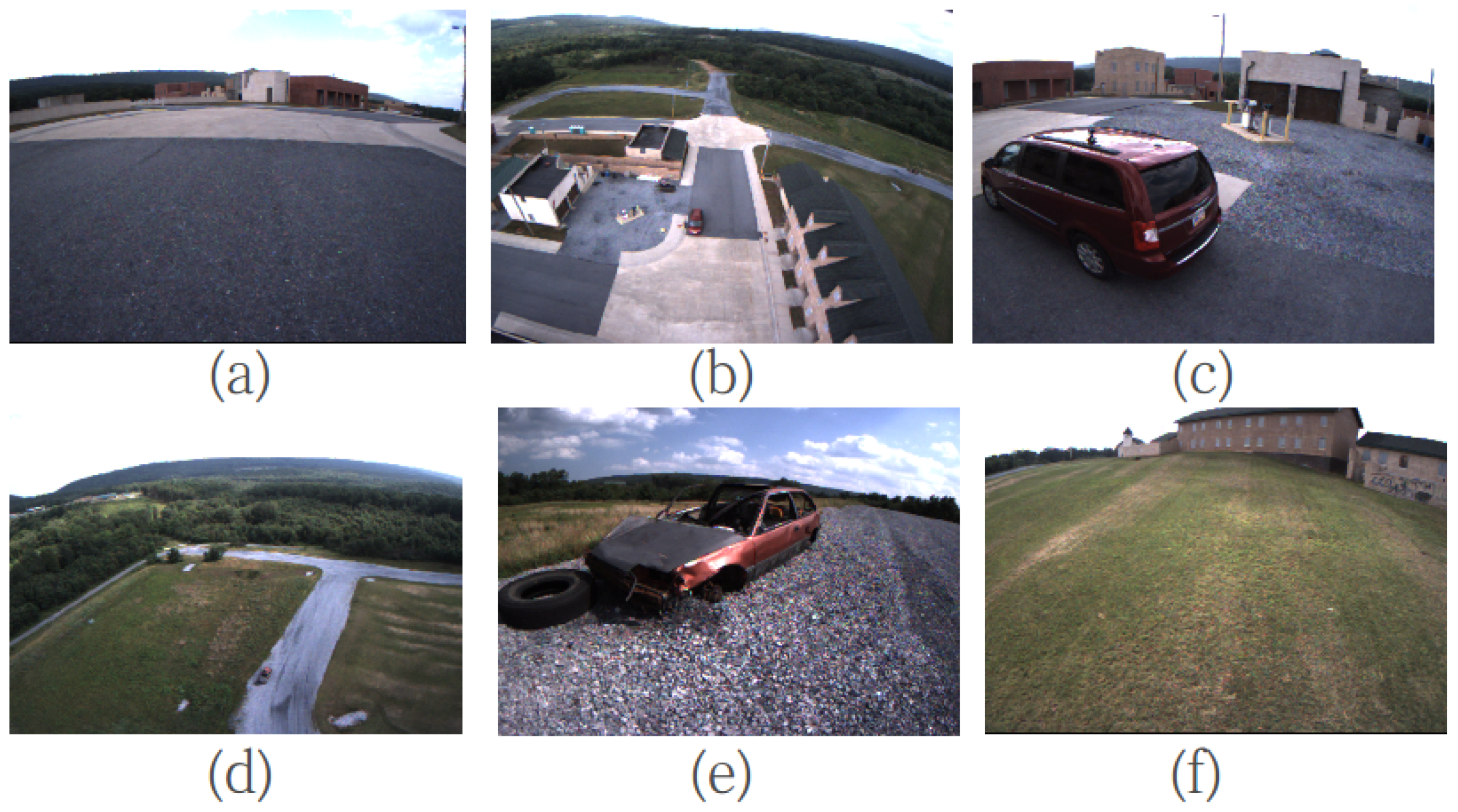 Some typical images from the experiment: (a) the MAV taking off; (b,d) the high-altitude flight; (c,e) low-altitude flight to capture the images for the two cars’ stereo reconstruction; and (f) the similar texture environment.