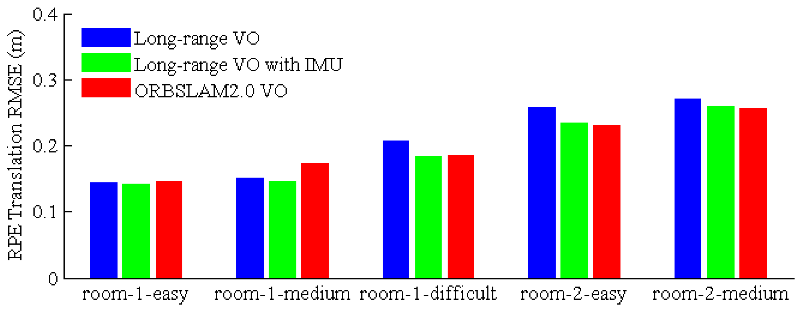 Figure 12 gives the RPE evaluation results. From the results, the proposed VO shows similar performance as the ORBSLAM 2.0. For the last dataset (room 2-difficult), all three approaches failed to track the pose at 67 s due to the serious image motion blur and low texture (so, we do not report the result for the last dataset). The VICON room datasets were recorded in relatively small indoor environments; the proposed VO works with pure stereo mode for most situations. Furthermore, the vehicle flies around the room several times for each dataset, so ORBSLAM 2.0 utilizes the built map to localize the vehicle, namely with the localization mode. In comparison, our VO is a sliding-window VO for the onboard memory and computing resource consideration; only some key-frames and their corresponding map points are kept for pose tracking and local BA. As a result, our VO works with exploration mode, which is more difficult than localization mode.