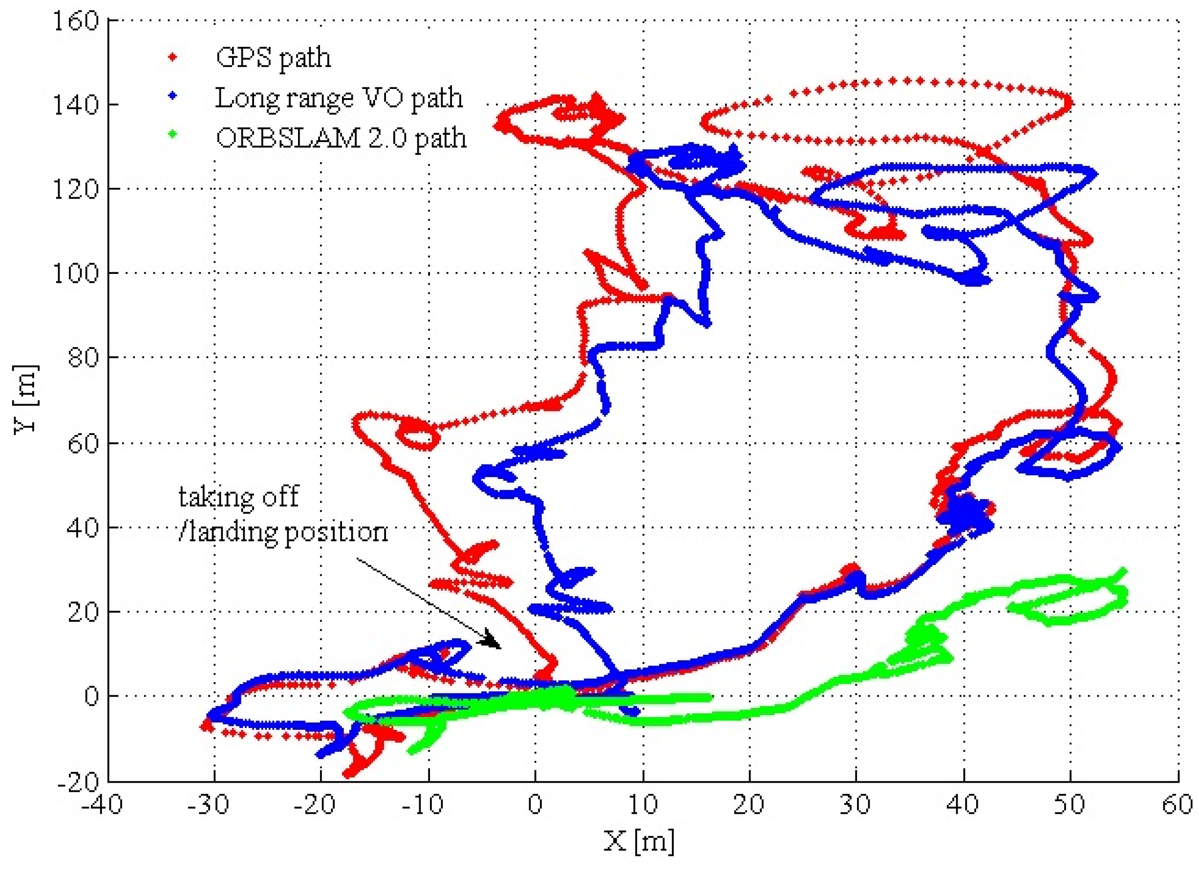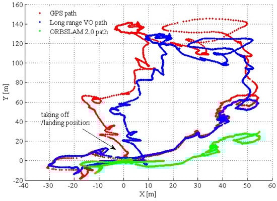 Comparison of the GPS path, proposed long-range VO path and ORBSLAM 2.0 path. The MAV takes off at position (0,0). At this position, we recorded the initial GPS and barometric measurements as the offsets for the subsequence ground truth measurements. The initial MAV heading is aligned with the NED coordinate. ORBSLAM 2.0 (also with IMU tightly coupled) fails at 400 s of the dataset.