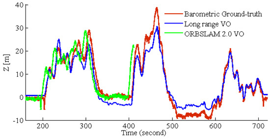 To test the long-range performance, the dataset recorded by our MAV is utilized. For this experiment, GPS and the barometer were utilized as the ground truth. The results are shown in Figure 13. For ORBSLAM2.0 VO, it easily fails to track aggressive MAV motion, so we also integrate the same IMU tightly-coupled strategy (Section 3.5) in ORBSLAM 2.0 VO. The altitude estimation results are shown in Figure 14; ORBSLAM 2.0 VO fails at 400 s of the dataset. At this time, the MAV altitude is sharply increasing, so ORBSLAM 2.0 VO cannot deal with this long-range high-altitude case. The path RMSE is listed in Table 1. The first row is long-range VO RMSE before the ORBSLAM 2.0 VO fails; the last row is the path RMSE for the entire MAV 12-min flights.