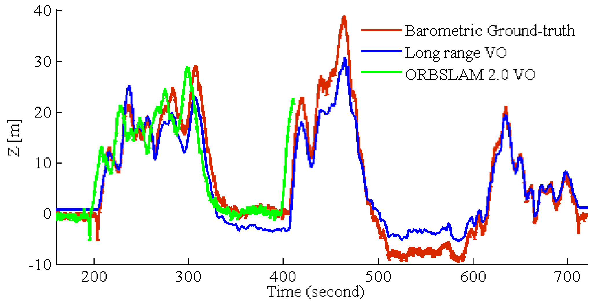 Comparison of long-range VO path and ORBSLAM 2.0 path in the altitude direction. ORBSLAM 2.0 fails at 400 seconds of the dataset. At this time, the MAV altitude increases sharply, so ORBSLAM 2.0 cannot deal with this long-range high-altitude case.