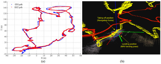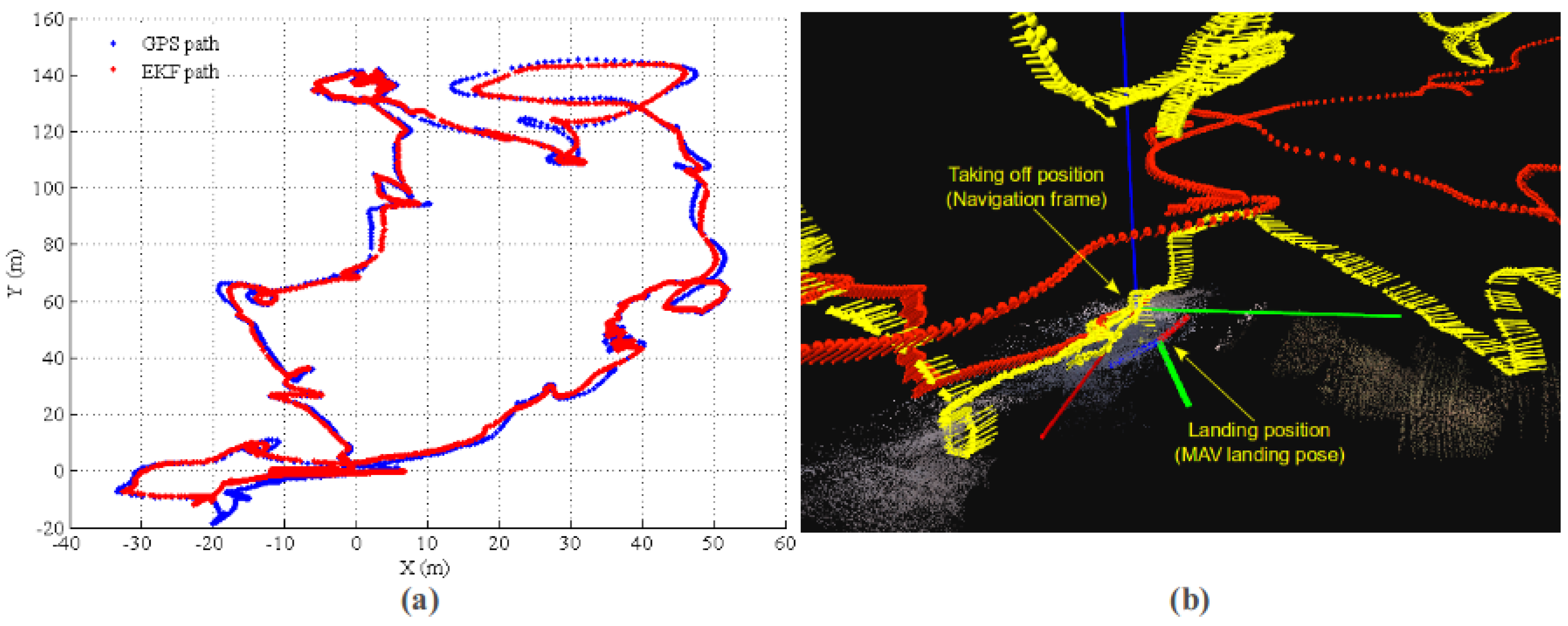 EKF state estimation result. (a) EKF estimation path in the X-Y plane; the MAV takes off at (0,0) and comes back after 12 min of flight; (b) local details for EKF state estimation. The yellow arrow sequence is the 3D path from EKF, and the red sequence is the GPS path. Clearly, GPS reports bad positioning information in the altitude direction.