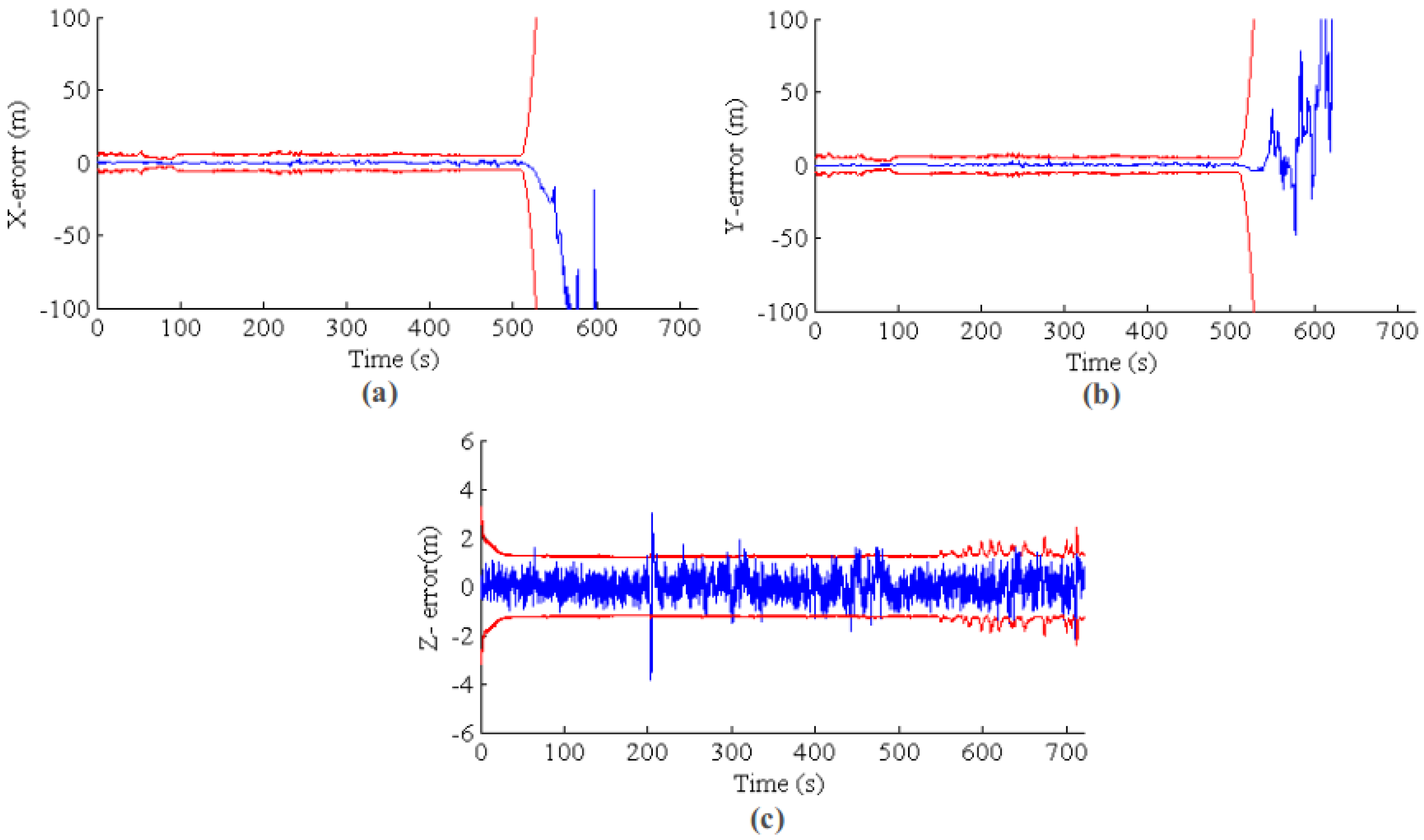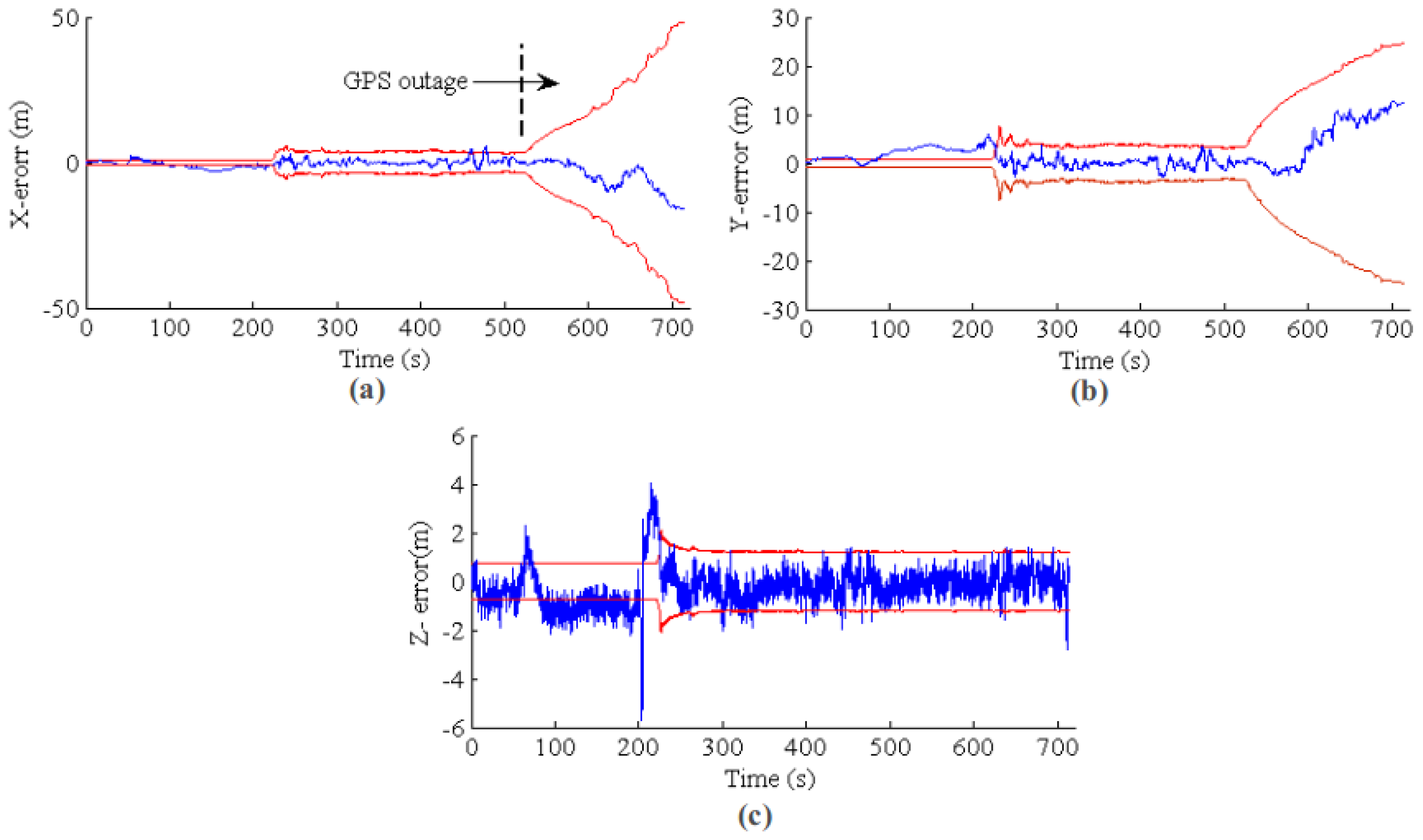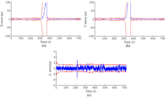 EKF state estimation for a long-term GPS outage from 500 s to the end. The blue line is the estimation error, and the red line is the 3σ error band. (a–c) The results for X, Y and Z, respectively.