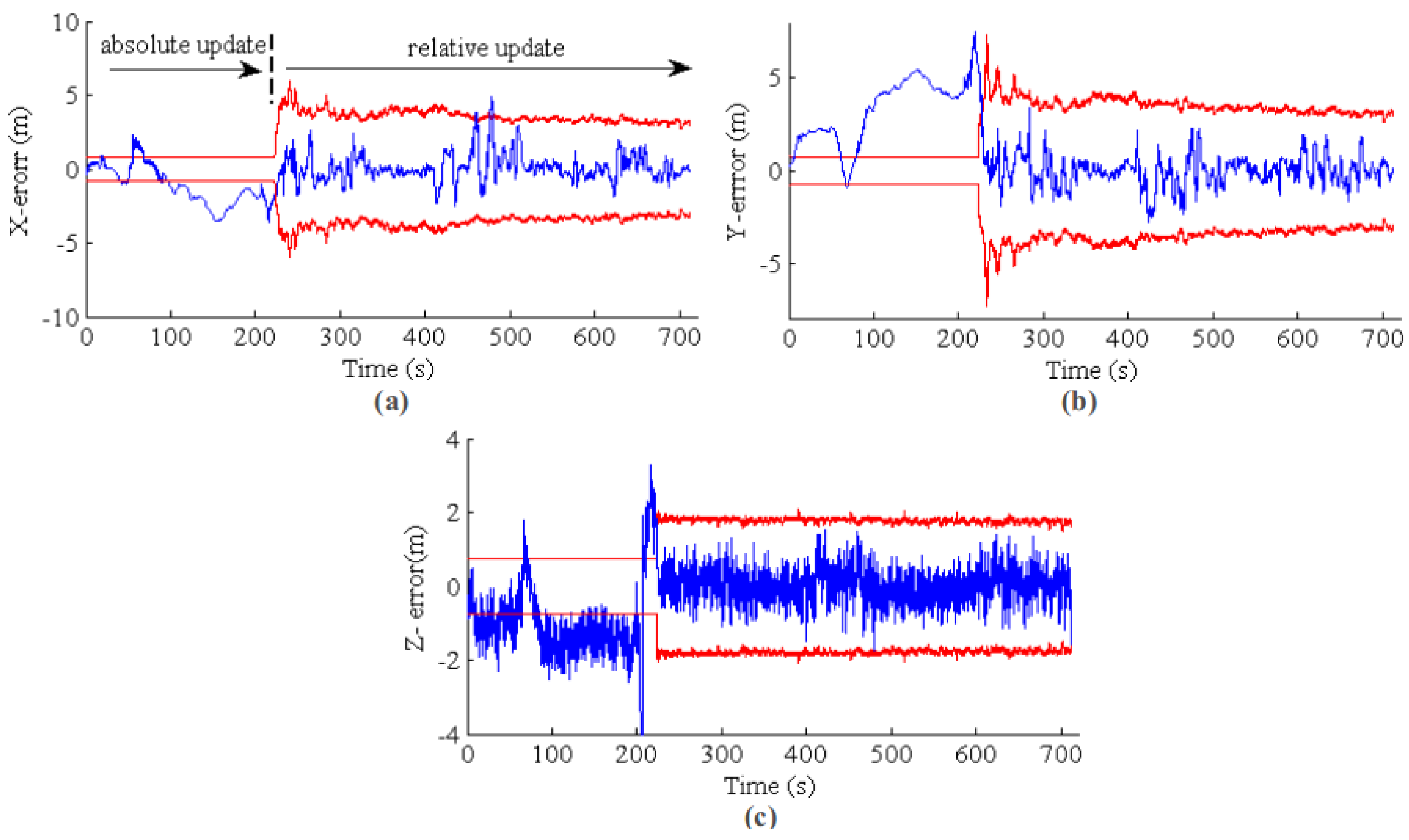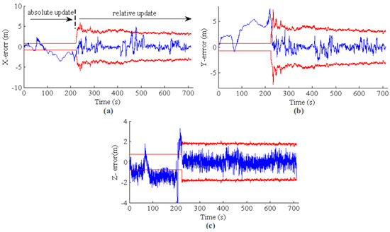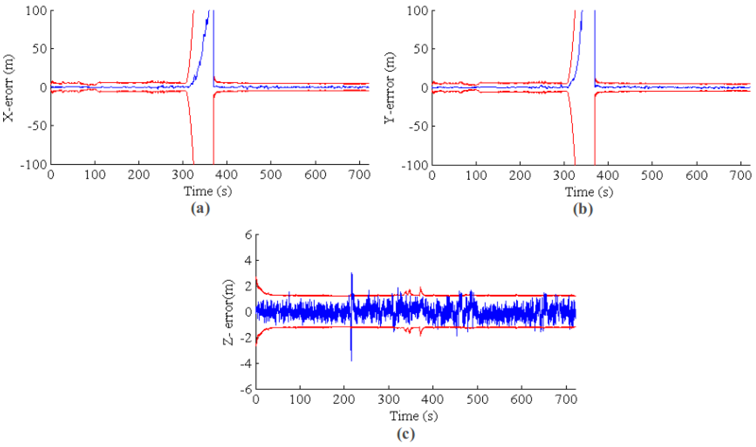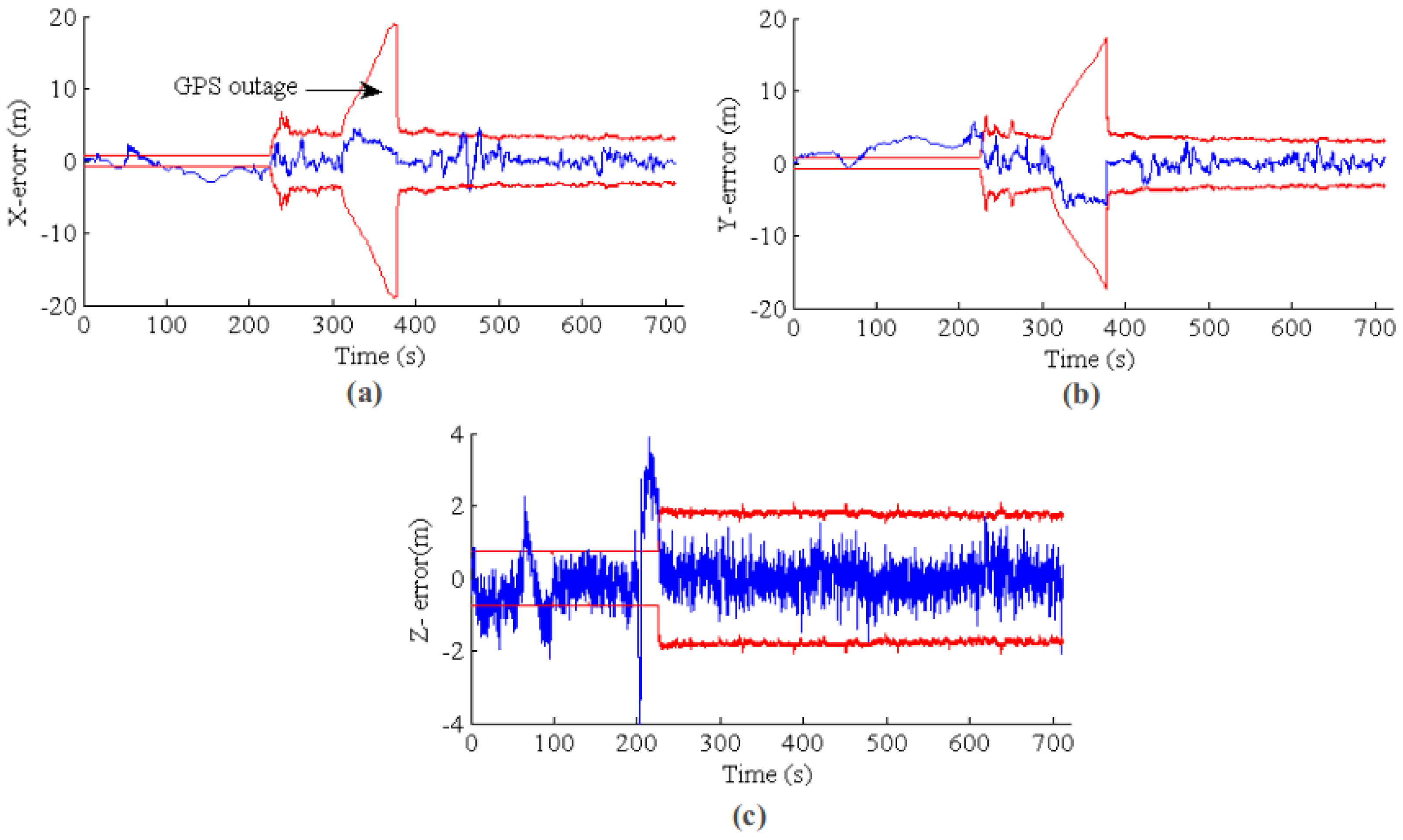 EKF state estimation for a long-term GPS outage from 500 s to the end. The blue line is the estimation error, and the red line is the 3σ error band. (a–c) The results for X, Y and Z, respectively.