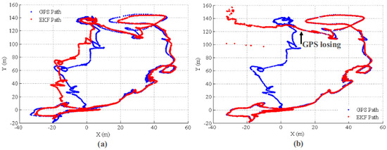 Estimated paths with/without VO update. The GPS outage starts at 500 s. (a) Path with VO relative update; (b) path without VO relative update.