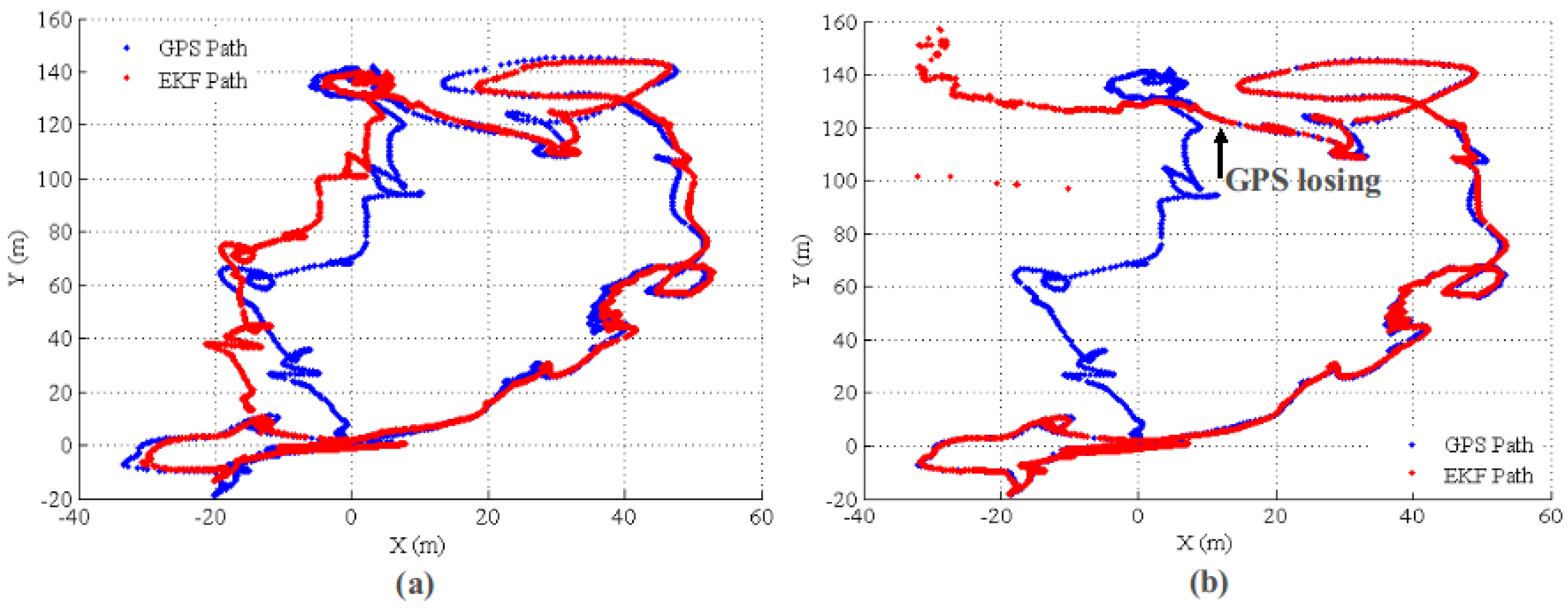 We utilized the “GPS health status”, which reports how many satellites can be seen by the receiver, to determine the current GPS measurement covariance. For bad “GPS health status”, GPS will report a large covariance. It is worth mentioning that the test at is utilized to verify the compatibility between current GPS measurement and the system predicted state. If GPS measurement “jumps” due to perturbation (e.g., multipath), the system will reject the GPS measurement automatically. In fact, all of the sensor measurements are firstly checked by the test before they are utilized for state estimation. As a result, the EKF state estimator is robust to any sensor failures.