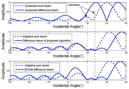 Consider a linear array with 16 elements equally spaced by half of the wavelength. The desired radar look direction is 20 away from the boresight. A deterministic target is located at the direction 20.8 off the boresight with the power of 10 dB relative to internal noise. Two noise jammers with the power of 30 dB relative to internal noise are incident from 10 and 14 off the boresight respectively. The sum beam is formed adaptively using (6). The beam patterns using the proposed algorithm and the MVAM are plotted in Figure 1. As a reference, the quiescent beam patterns are also plotted. For the proposed algorithm, is set to be 4 (half of the 3 dB beamwidth), because . It can be seen from Figure 1 that the mainlobe of the sum beam pattern is slightly nudged away from the desired look direction due to the strong jammers. Two clear nulls can be observed at the directions of jammers for both of the methods, providing jammer rejection. However, the proposed algorithm places another null at the radar look direction because of the constraint while the MVAM only tends to have a null at the look direction [].