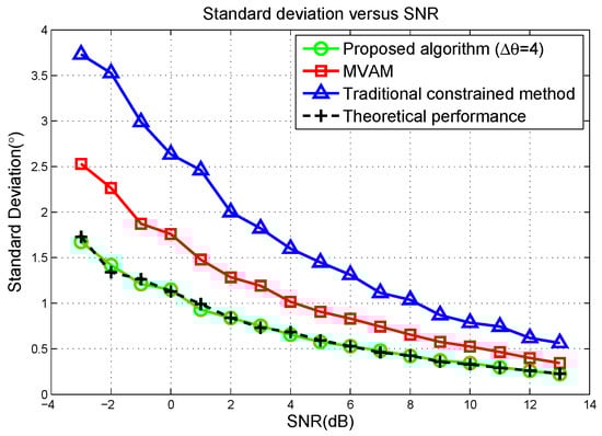 Standard deviation versus the SNR in scenario 1 of linear array simulation.