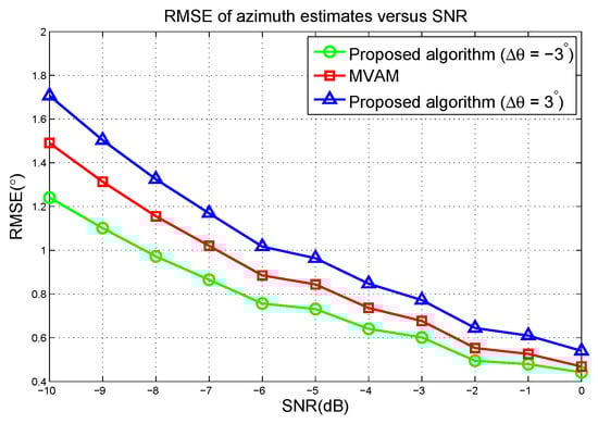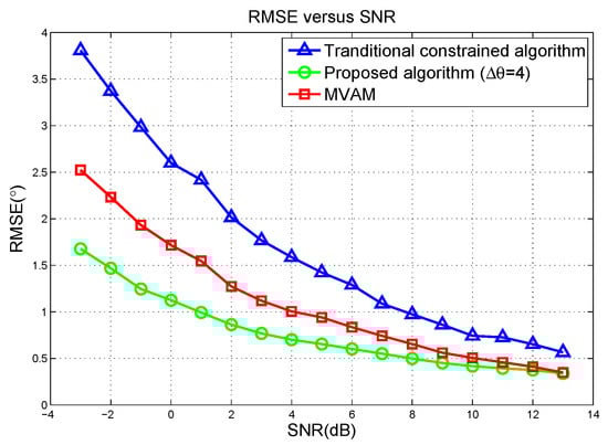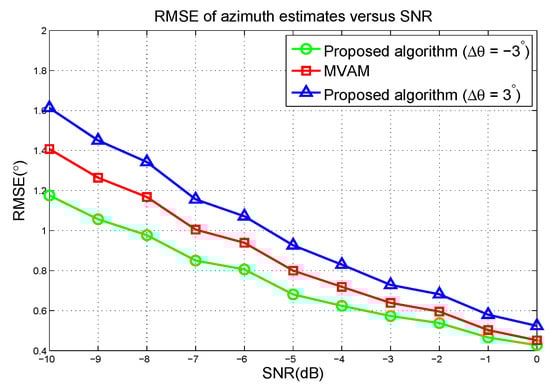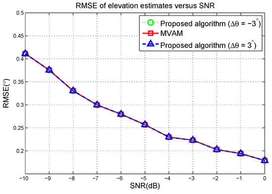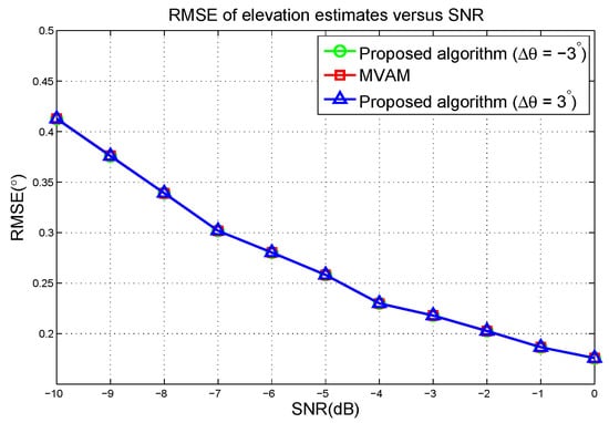 The RMSE of elevation estimates versus the SNR are plotted in Figure 8. From Figure 8, we can see that the proposed algorithm and the MVAM have the same performance at each SNR. Therefore, we demonstrate that by choosing close to 0, the proposed algorithm gives the same performance as the MVAM.