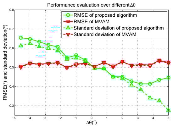 The effect of choosing different is evaluated in Figure 4 where the MVAM is used as a comparison. SNR is set to be 10 dB. It can be seen that the RMSE of the proposed algorithm slowly decreases with growing until reaches half of the beamwidth and the RMSE near 0 is approximately equal to that of the MVAM. This result shows that by optimizing , the proposed algorithm can achieve better performance than the MVAM. It can also be observed that the standard deviation continues to decrease with growing beyond the half of beamwidth which is analyzed in section III. However, the RMSE deteriorates after that point which suggests that, in this case, the bias of the estimation cannot be ignored.