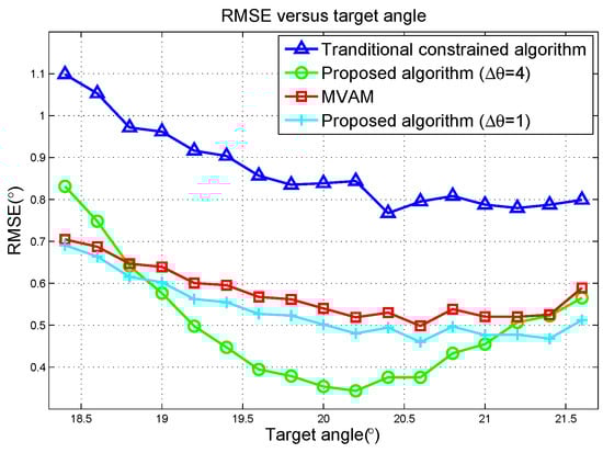 Finally, the RMSE versus target angle is plotted in Figure 5. When the target is very close to the radar look direction, the proposed algorithm with achieves much better performance than the MVAM and the traditional constrained method. However, its performance deteriorates fast with the target offset angle growing and would be worse than the MVAM when the offset angle continues growing. This deterioration is due to the bias increase of the estimation. As can be seen in Figure 5, when is adjusted to 1, the proposed algorithm has better performance than the MVAM at every offset angle of target. However, compared with the case where , its RMSE is worse at positions close to the radar look direction.