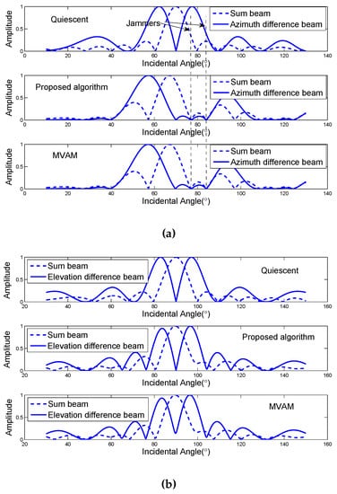 To alleviate distortion in the sum beam, a technique called “diagonal loading” has been introduced [,,]. This technique, in general, makes a compromise between beam distortion and nulling depth by adding a diagonal matrix to the data covariance matrix. It has been proved that diagonal loading is mathematically equivalent to adding constraints about the pointing direction when forming sum beam weights []. By choosing a proper loading coefficient, the shape of the main beam can be maintained to be approximately the same while imposing sufficient suppression of the interference.