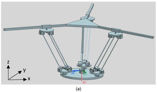 Many other kinds of parallel manipulators having been designed and developed during the past decades, all with purpose of further improving their performance [4,5,6,7], e.g., stiffness, workspace, positioning accuracy, acceleration, and dynamic characteristics. In reference [8], a 3-DOF tripod manipulator was proposed by Zhang, where a passive link is added to the system with the aim of increasing the stiffness of the robotic system and eliminating unexpected movements. In reference [9], a TAU hybrid manipulator was proposed. The advantage of this type of manipulator is that it combines the features of serial manipulators and parallel manipulators, which increases its end-effector workspace and its stiffness still remains high.