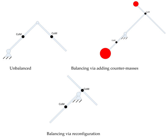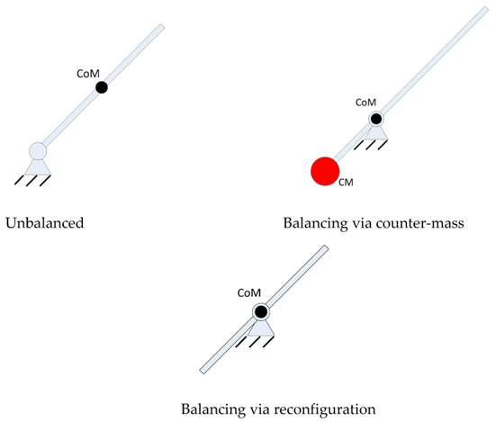 Inspired by the above design, here dynamic balancing based on the reconfiguration notion is put forward. Taking the following case as an example, one can employ ac screw linkage and the linkage is able to shift, in this way the linkage’s center of mass can be shifted to the position where the revolute joint resides, and it is therefore balanced. Through this approach, one does not employ a counter-mass but via reconfiguring the system by shifting the linkage, which does not make the system heavier. The following Figure 3 illustrates the notion of balancing based on reconfiguration.