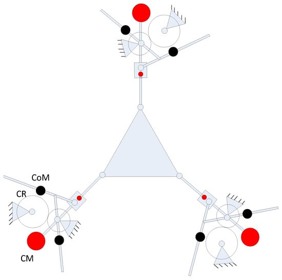 Based on the previous analysis, one can see that force balancing based on the reconfiguration notion will not include an extra counter-mass, and on the other hand, if balancing is accomplished by resorting to adding an additional counter-mass, the entire system be heavier. After applying this concept to the crank-slider mechanism, the crank-slider system which is balanced based on the reconfiguration notion is used as a Scott-Russell mechanism in place of the conventional version type [18] and we join the crank-slider system to every single limb of the 3-RPR parallel mechanism, as illustrated in Figure 5. In order to achieve complete dynamic balancing, three counter-rotations have been added within the system, as illustrated in Figure 5, where CR stands for counter-rotation, the red solid circle represents a counter-mass, and the black solid one stands for the center of mass.