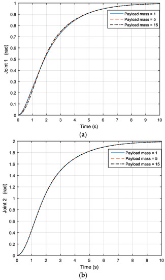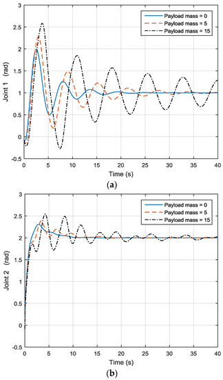 Here a two-DOF link manipulator (as shown in Figure 9) will be used as an example. After applying different payload masses, joint 1 motion output is illustrated in Figure 10a while joint 2 motion output is shown in Figure 10b. For joint 1, when the payload is 0, the motion is quite steady, but when the payload increases to 5 and 15, one can see that joint 1 motion is no longer the same, as shown in Figure 10a, and the simulation also shows that the joint output increases and decreases. The same applies to joint 2, as seen in Figure 10b. This has led to the use of adaptive control, especially model reference adaptive control (MRAC). Dubowsky [26] was the first to apply the MRAC concept to a robotic manipulator. The author employed a linear time-invariant differential formulation to be the reference model for each joint of the robot. The robotic system was maneuvered through altering the feedback gains to follow the model.