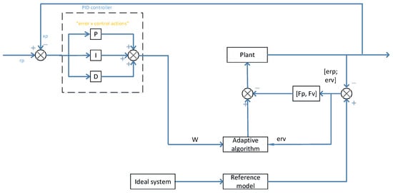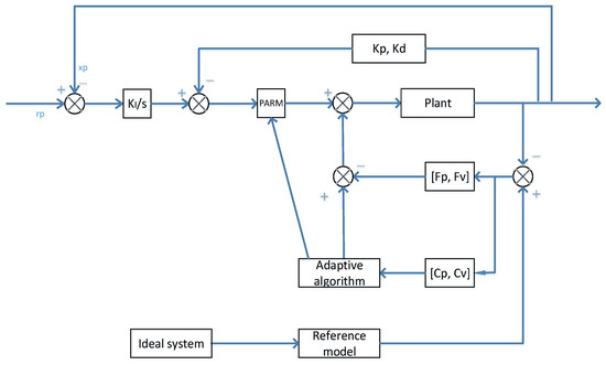 Regarding the MRAC controller, Figure 11 shows such a system. The plant’s output is going to be compared to the reference model output, whereby this action results in an error. The error then is going to be processed inside the adaptation section and the result will be provided as one of the input parts to the plant. Meanwhile, the plant’s output is going to be compared to the desired model rp and another error is subsequently generated. This error is processed by the integration action and the result of which will subtract the position and velocity that are processed by the Kp and Kd elements. This procedure is comparable to the PID control. The output from this procedure, multiplies the products from the adaptation block, adds the products from the adaptation block, is going to be the plant’s input. This action continues till the error between the plant’s output and the output from the reference model goes to zero. The ideal system is independent from the plant, so that the plant feedback values are not being utilized to influence the reference model input. The reference model input will be dealt with by its own output variables via the “seemingly PID controller”. The ideal system is not influenced with regards to the plant.