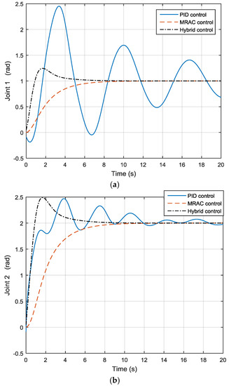 As shown in the previous in Figure 10, after applying different payload masses and moving the robot from one position to another, when the payload is 0, joint 1 motion is quite steady, but when the payload increases to 5 and 15, joint 1 motion is no longer the same, and the joint output also increases and decreases. The same applies to joint 2. By using the hybrid approach, the three lines coincide with each other under different payload masses, as shown in Figure 13, so the payload mass variation effect has been compensated. Furthermore, as shown in Figure 14, one can see that the rate of convergence for the new hybrid control system is quicker than that of the MRAC control system, and the hybrid control and MRAC control systems both beat the PID control system.