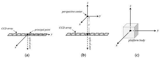 In order to establish the relation between IRF and GRF, two mediator coordinate systems are defined: Sensor Reference Frame (SRF) and Platform Reference Frame (PRF). SRF is a pseudo-3D coordinate system with its origin on the exposure station. Its x and y axes coincide with the corresponding axes of IRF, and its z axis passes through the instantaneous exposure station (Figure 1b). The relationship between IRF and SRF is established based on the IOP of the sensor. PRF is co-origin with the SRF, and its axes are locked to the body of the platform (Figure 1c).
