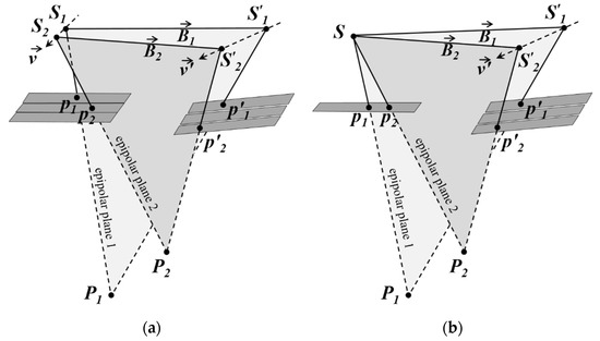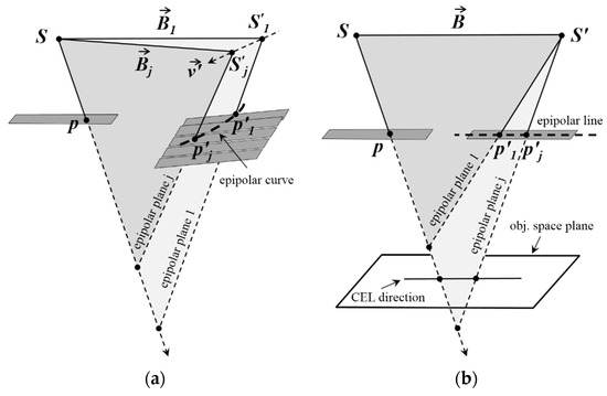 The main difference between frame-type cameras and linear pushbroom sensors is that each scanline of linear imagery has a distinct perspective center. As a result of this characteristic, there will be several epipolar planes on the second scene for a given point p in the first scene [1], and hyperbola-shape epipolar curves (instead of epipolar lines) of linear imagery is due to the non-coplanarity of these planes [1,8] (Figure 2a). For cross-track stereo coverage, the necessary and sufficient condition for coplanarity of all epipolar planes and formation of straight epipolar lines is that the scanlines containing CIPs to be parallel with their IB in a common plane (Figure 2b).