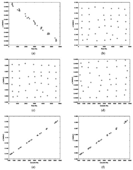Scatter plot of the direction of IBs with respect to the rows- and columns-number of CIPs: (a) ω vs. the rows-number; (b) ϕ vs. the rows-number; (c) κ vs. the rows-number; (d) ω vs. the columns-number; (e) ϕ vs. the columns-number; (f) κ vs. the columns-number.