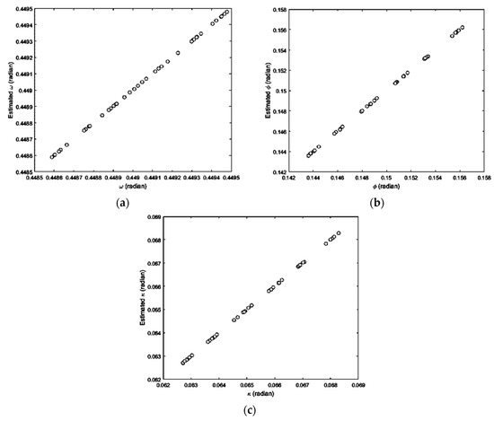 Scatter plot of computed and estimated attitude parameters of the IB of CIPs: (a) Attitude parameter ω; (b) Attitude parameter ϕ; (c) Attitude parameter κ.