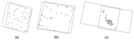 Distribution of GCPs throughout the stereo imagery: (a) Isfahan dataset; (b) Zanjan dataset; (c) Fars dataset.