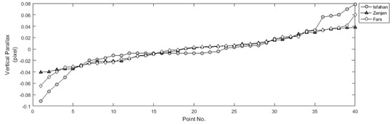 In order to assess the accuracy of the proposed method two factors were examined: (1) the ability to eliminate the vertical parallaxes of CIPs; and (2) to provide a linear relationship between the horizontal parallaxes of CIPs and their heights in the object space. Before applying the proposed epipolar resampling method, the mean values of vertical parallax of CIPs for Isfahan, Zanjan, and Fars datasets were 174, 184.4, and 106.7 pixels, respectively. According to Table 4, in all experiments the maximum absolute values of the residual vertical parallax of normalized scenes are close to zero. Therefore, the proposed method has a high ability to eliminate the vertical parallaxes of CIPs. The residual vertical parallax of CIPs in Experiments 2, 6, and 10 are illustrated in Figure 8, where the horizontal axis shows the points’ number ordered by increasing the residual parallax, while the vertical axis shows the value of vertical parallax.