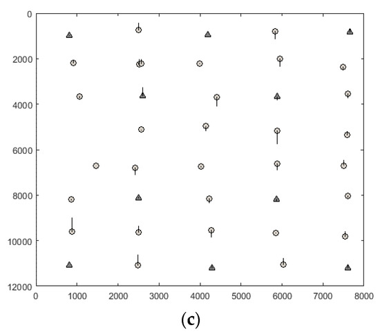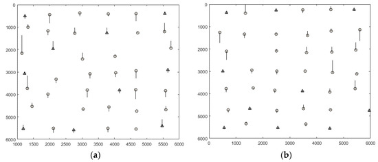 Moreover, in order to examine the pattern of the vertical parallaxes on the normalized scenes, the scatter plot of the vertical parallaxes of CIPs in Experiments 2, 6, and 10 are shown in Figure 9. In this figure, the CoCP and ChCP are illustrated with the triangle and circle markers, respectively. The vertical parallaxes of CIPs are drawn with a magnification factor of 10,000.