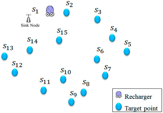 Assume that the working scenario of the proposed recharging algorithm is an indoor sensor network. In this scenario, there is no sunlight or other environmental energy recharging mechanisms that can be applied to recharge the sensors. Given a monitoring region O, this paper assumes that a set of h static sensors is distributed over region O, where denotes the sink node. All sensors have the same sensing rate and their readings are directly transmitted to the mobile recharger. Therefore, the energy consumption rates of all static sensors are equal. Each static sensor is equipped with a rechargeable battery with limited capacity. A mobile recharger, denoted by M, should move with a constant velocity and periodically visit each static sensor, aiming at collecting data from each static sensor and recharging the visited sensor during a predefined period T.