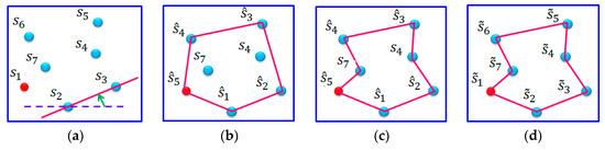 In the first step of this phase, a convex polygon must be constructed starting at the sensor . Let . As shown in Figure 2a, the dotted horizontal line is φ. Then, turn φ in a counterclockwise direction until it touches the first point , which plays the role of . Similarly, treating sensor as , the point can be identified. Repeatedly perform the abovementioned operations, until is finally identified. Then the path can be constructed as: