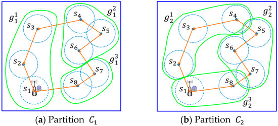In fact, the path reduction is a big challenge. Each sensor can have many neighbors. It is difficult for determining the previous and next visited sensors by selecting sensors from neighboring sensors of . This occurs because that the length of recharging path is highly related to the positional relationship of two adjacent sensors. To simplify the path reduction, this phase partitions all sensors into groups.