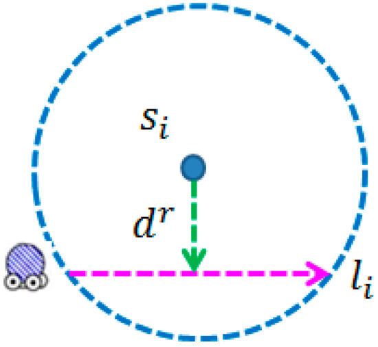 It is obvious that the static sensor can be recharged only if the mobile recharger M is within Ri. The following presents how to construct a recharging segment for each sensor. Recall that the segment is a straight line between entering point and leaving point and denote the length of . The total recharging energy of obtained from the M can be evaluated by applying Equation (11):