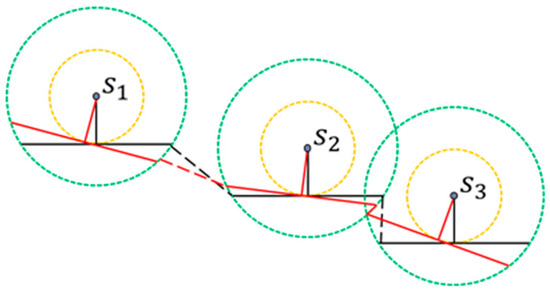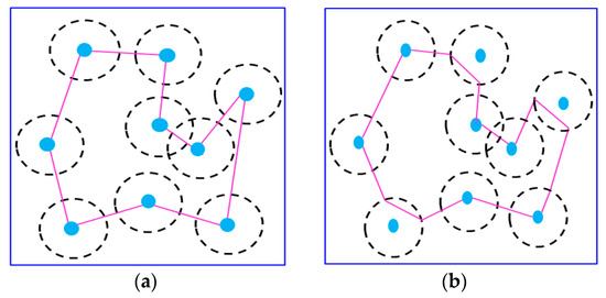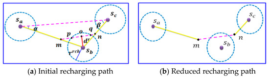 As shown in Figure 5a, the yellow path represents the initial recharging path of group . Let be the middle sensor of group , the length that falls inside the recharging range of sensor is . The path reduction can be achieved by the following operations. The triangle connecting sensors is denoted by , as shown in Figure 5a. We shift the segment toward , until the distance between sensor and the segment is equal to . Let points and represent the intersecting points of recharging circle of sensor and segment . The path in this example can be considered as the , which has the important property that the recharger M moving along the recharging segment with a constant velocity can fully recharge the battery of sensor . As a result, a new recharging path of group can be constructed, as shown in Figure 5b. Compared with the initial path in Figure 5a, the length of the constructed path in Figure 5b has been significantly reduced. The above mentioned operations should be applied to all groups such that the subpath length for each group can be reduced.