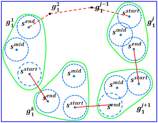 This task aims to reduce the length of subpath for each group. The major work of this task is to construct the recharging segment for middle sensor of each group. By applying the Triangle Theorem, a reduced recharging path of a group can be constructed. Then, we apply the proposed operations to each group of three partitions , and . As a result, the reduced subpath of each group can be constructed.